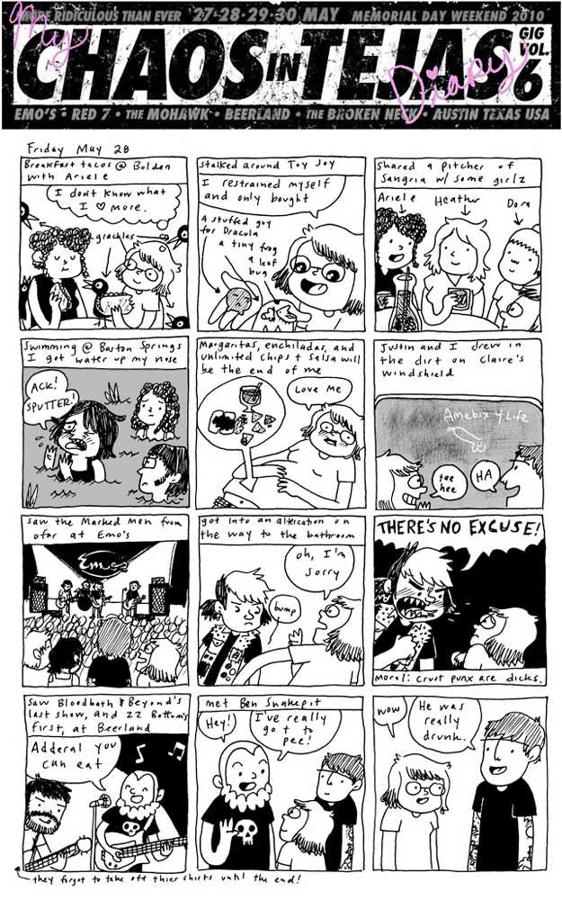 Day 2 and I get to spend the entire day with Ariele, who took me to get some kick-ass breakfast tacos, had me dunk my head in the swimming hole, and taught me how to love again. If I came to Chaos to see any band, it was definitely Marked Men, and if there was anything that harshed my buzz, it was being sneered at by the vast army of crust punks who lined every nook and cranny of Austin that weekend.