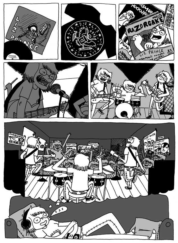 This comic is my ultimate band fantasy boner; as someone who's never had any musical talent, I will often listen to my favorite bands and fantasize that I'm the one playing the songs. I can never settle on which instrument I think would be most fun to play, so I decided to give myself every role, and then I figured that since my band would only play all the songs I like the most, I would make up the entire audience. Hot Liz on Liz mosh pit action!!!